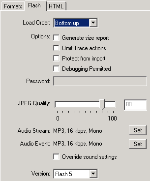 Load order serve a determinare l'ordine di caricamento dei layer: � questo un indicatore importante anche nei casi in cui non ci sia un filmato di preload. Generate size report produce un file di testo che indica il peso in byte di ogni frame. Protect from import � un'opzione importantissima perch� rende il filmato protetto per cui non pu� essere scaricato e aperto in Flash. JPEG quality determina la qualit� grafica delle immagini bitmap contenute nel filmato, per cui una qualit� bassa alleggerisce il filmato e una alta lo appesantisce. Audio stream e audio event determina la compressione dell'audio se questa non � stata gi� specificata all'interno del filmato per ogni suono, se si seleziona Ovveride sound settings, le caratteristiche di compressione dei singoli suoni vengono sovrascritte. Version, � questa un'indicazione utilissima perch� ogni versione ha il suo plugin o ActiveX per cui se si salva un filmato in Flash 4.0 occorre un lettore per Flash 4.0, inoltre il salvataggio in alcuni formati, come Java, � possibile solo per alcune versioni (per Java solo la 2.0). La scelta, per�, non pu� essere arbitraria perch� un filmato creato con Flash 4.0 non pu� essere salvato sempre in una versione anteriore senza eliminare alcune caratteristiche (ad esempio alcuni comportamenti sono validi solo per la versione 4.0 e se non vengono eliminati o sostituiti, non possono essere salvati in una versione diversa). [ I n d i c e ] |