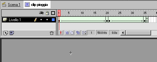 Si pu� usare lo Shape come non lo si pu� usare e ricorrere alle tecniche della Motion twening allo scopo di ottenere l'effetto pioggia. Si procede ad aprire Flash 5 e quindi a settare lo stage con 640 X 480 con sfondo appropriato. I dati inseriti sono molto importanti per far funzionare la funzione random nello spazio indicato. Anche la velocit� ha la sua importanza perch� l'effetto sia pi� reale possibile. Dato che la clip ha una funzione random, avremo effetti diversi ogni volta che verr� caricata dando l'impressione che la pioggia non � mai la stessa. ) Per vedere l'effetto della funzione random baster� fare il reload di questa pagina.