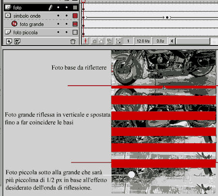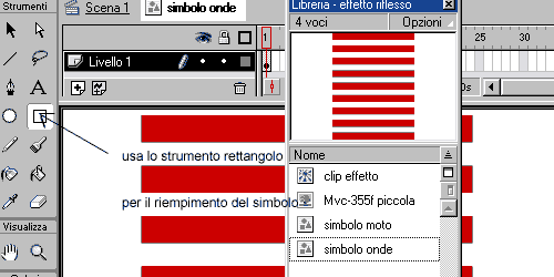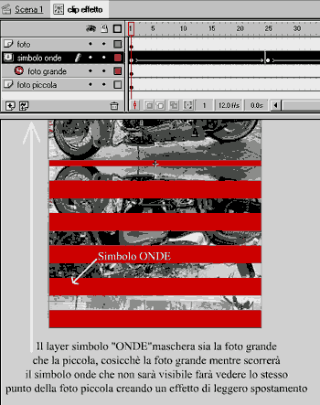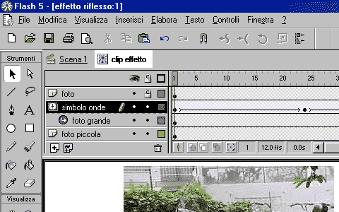 Creato il simbolo, lo porteremo dentro alla clip "effetto" avendo cura di metterlo in un layer sotto a quello della foto inserita precedentemente e che chiameremo simbolo onde.