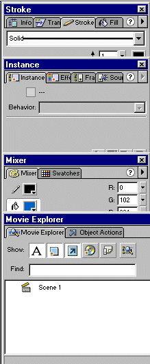 La grossa novit� di Flash 5.0 � la presenza dei Pannelli che, per quanto riducano le dimensioni dello Stage, si rivelano utilissimi consentendo di lavorare facilmente. Alcuni pannelli ripetono spesso elementi gi� presenti nel Toolbox o elementi poco utilizzati, mentre altri appaiono di grande importanza.