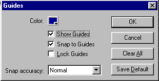 qui si possono impostare il colore della griglia, la larghezza e l'altezza dei quadrati del reticolato, e la modalit� di snapping o agganciamento (da un agganciamento pi� preciso ad uno pi� blando). Le caselle di Show Grid o Snap to Grid sono impostati secondo quanto fatto precedentemente. I parametri impostati si possono salvare con Save Default. Per vedere come funziona la griglia occorre vedere la lezione sullo strumento Freccia. Le guide Le guide, invece, identificano i contorni dell'oggetto e facilitano il disegno in quanto il colore e il contenuto dell'oggetto pu� coprire ci� che � sottostante.