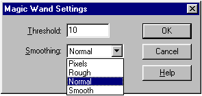 La selezione poligonale opera tracciando linee rette: ad ogni click � un estremo, mentre il doppio click indica il punto dell'ultimo estremo. E' valida la regola precedente: non � necessario descrivere un poligono chiuso, sar� il programma a tracciare l'ultimo segmento. La bacchetta magica, invece, � uno strumento conosciuto bene da chi ha gi� operato con programmi di grafica bitmap perch� consente di selezionare aree di colore uguale o simile: i parametri sono indicati dall'icona che le sta a fianco. Al click si apre la seguente finestra: