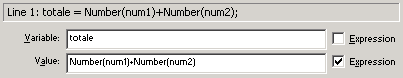 Con le stesse modalit� viene eseguito il prodotto tra due numeri interi sostituendo semplicemente il segno di addizione + con il segno della moltiplicazione * Per la divisione tra due numeri occorre introdurre i puntini nel text options. Questa scelta � d'obbligo visto che il rapporto tra due numeri � quasi sempre un numero decimale. Perci�, la variabile totale si scriver�: Come dicevamo, per la variabile � necessario usare l'azione setVariable.